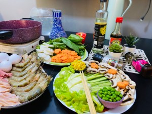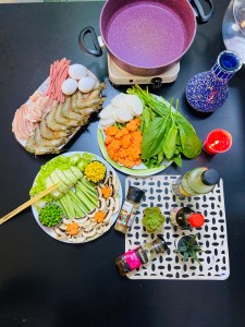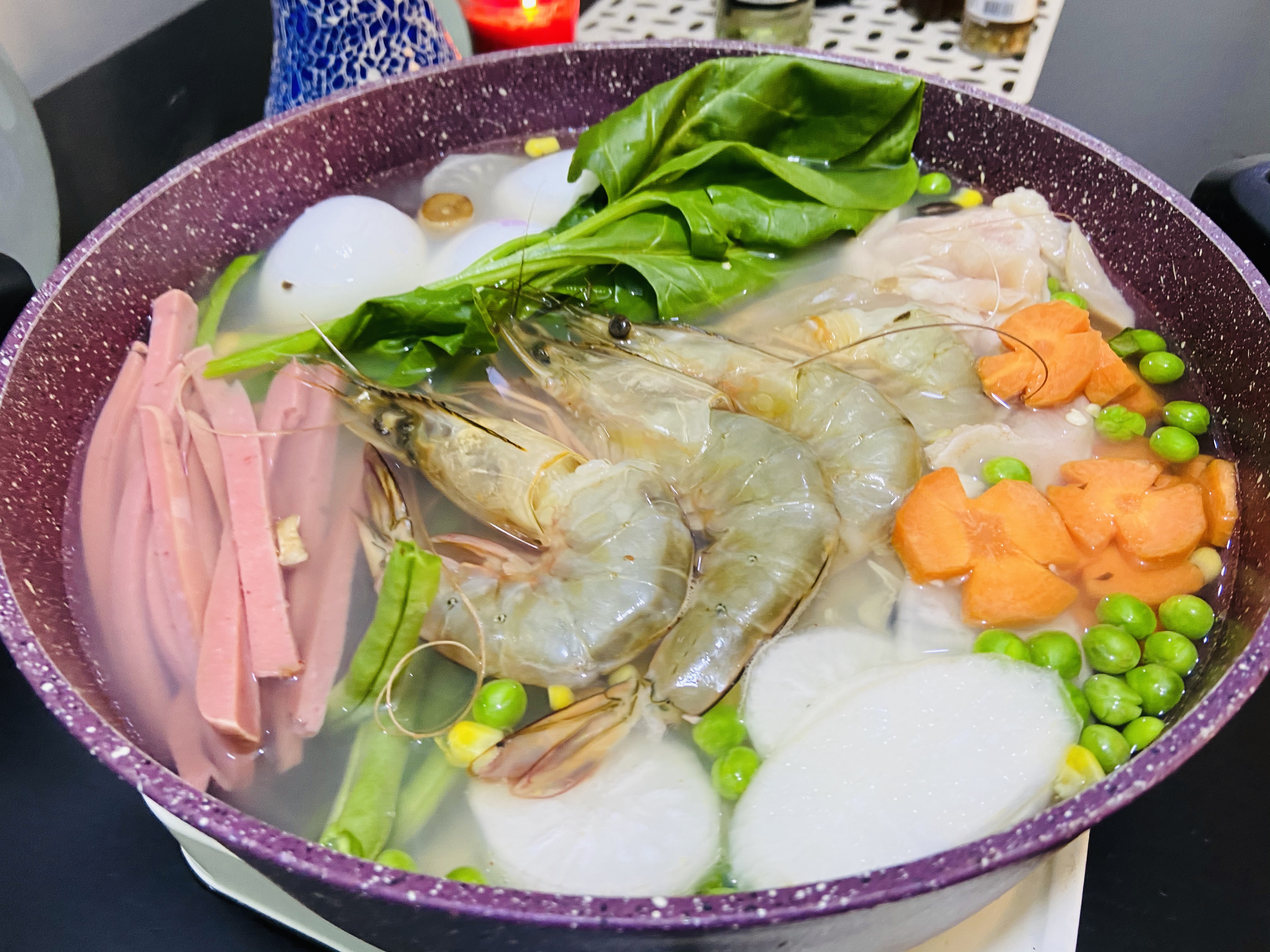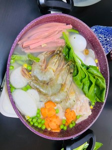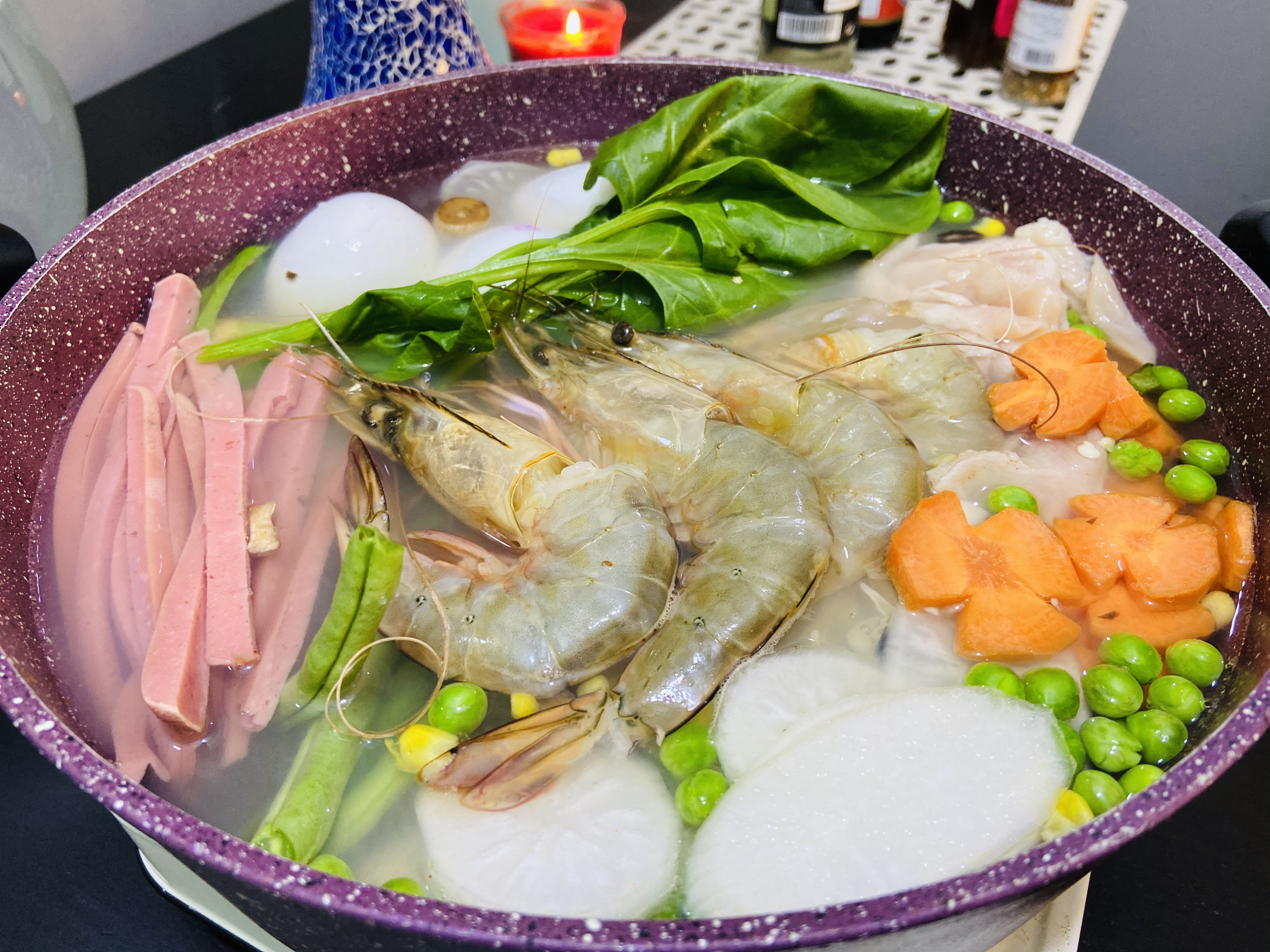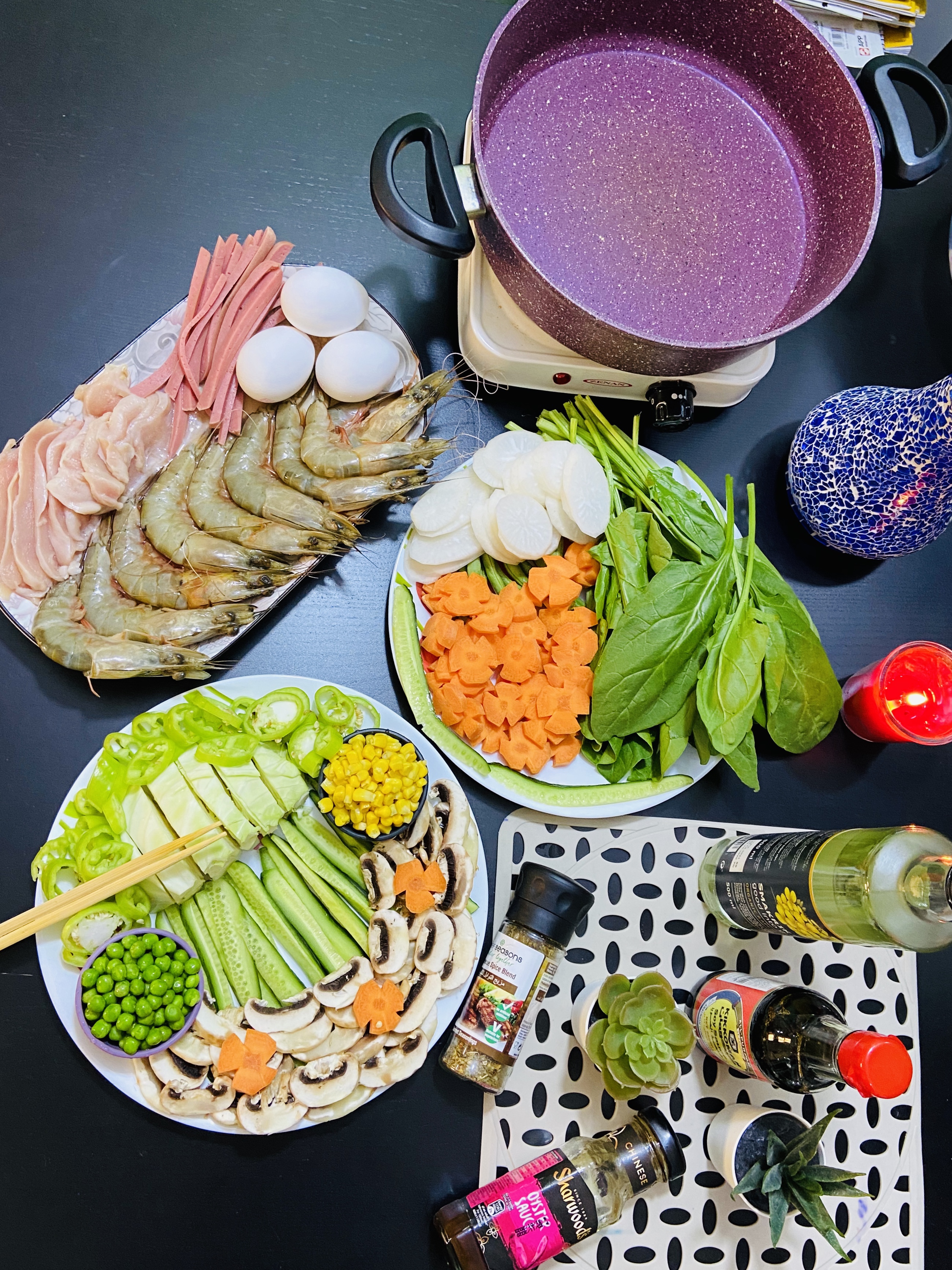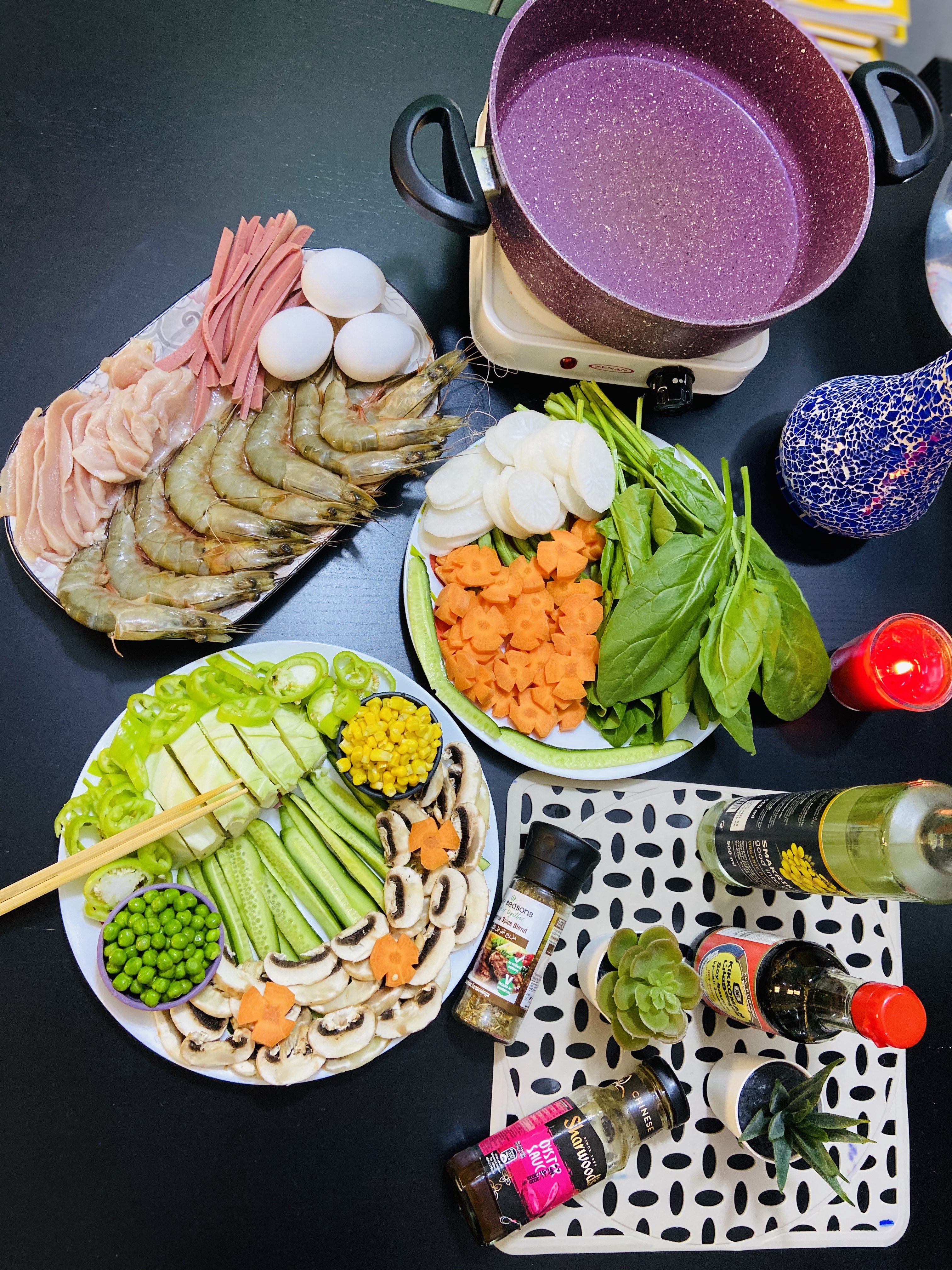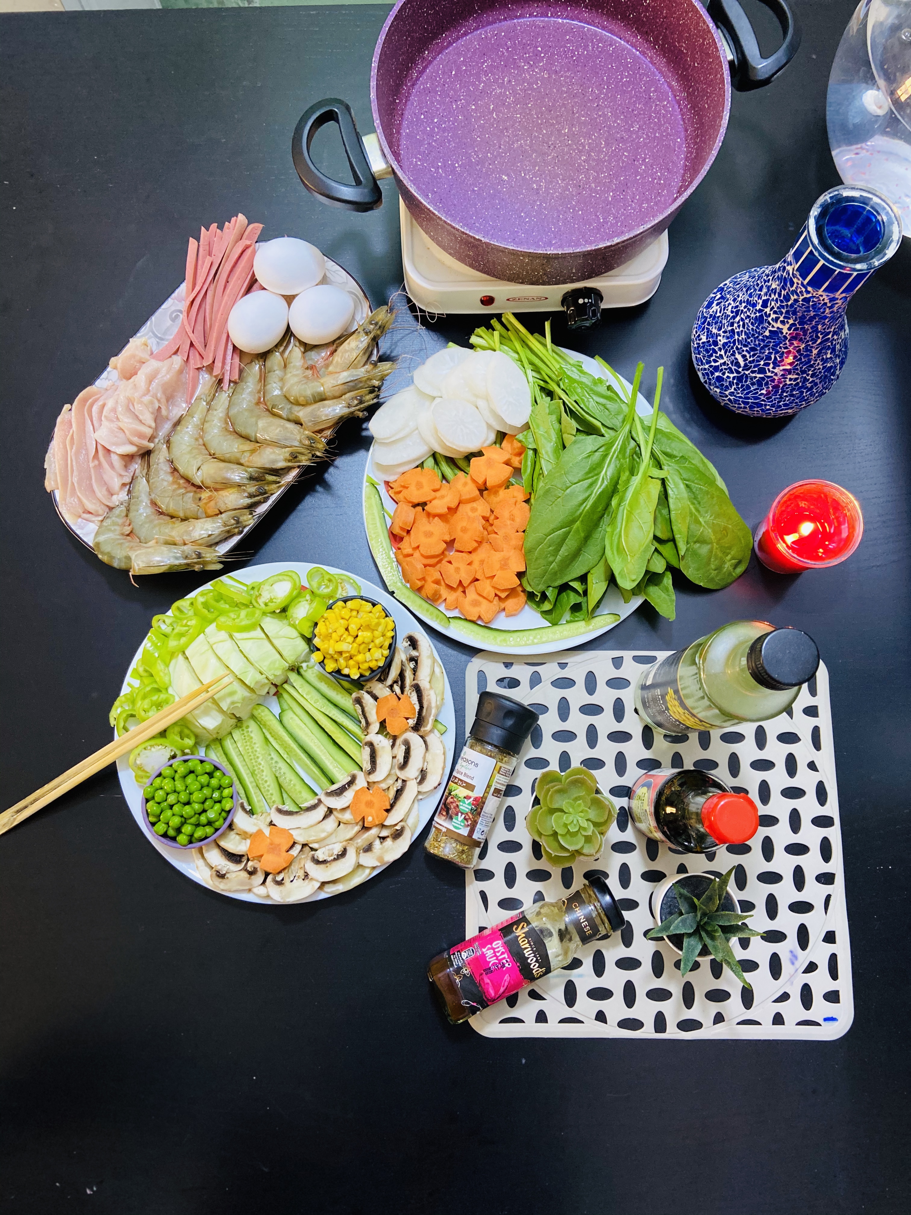 first, I took the hotplate and placed it in the middle of the table and I washed and cut the ingredients for the dish as soon (you can take whatever you want) vegetables, meat, and fish 😇